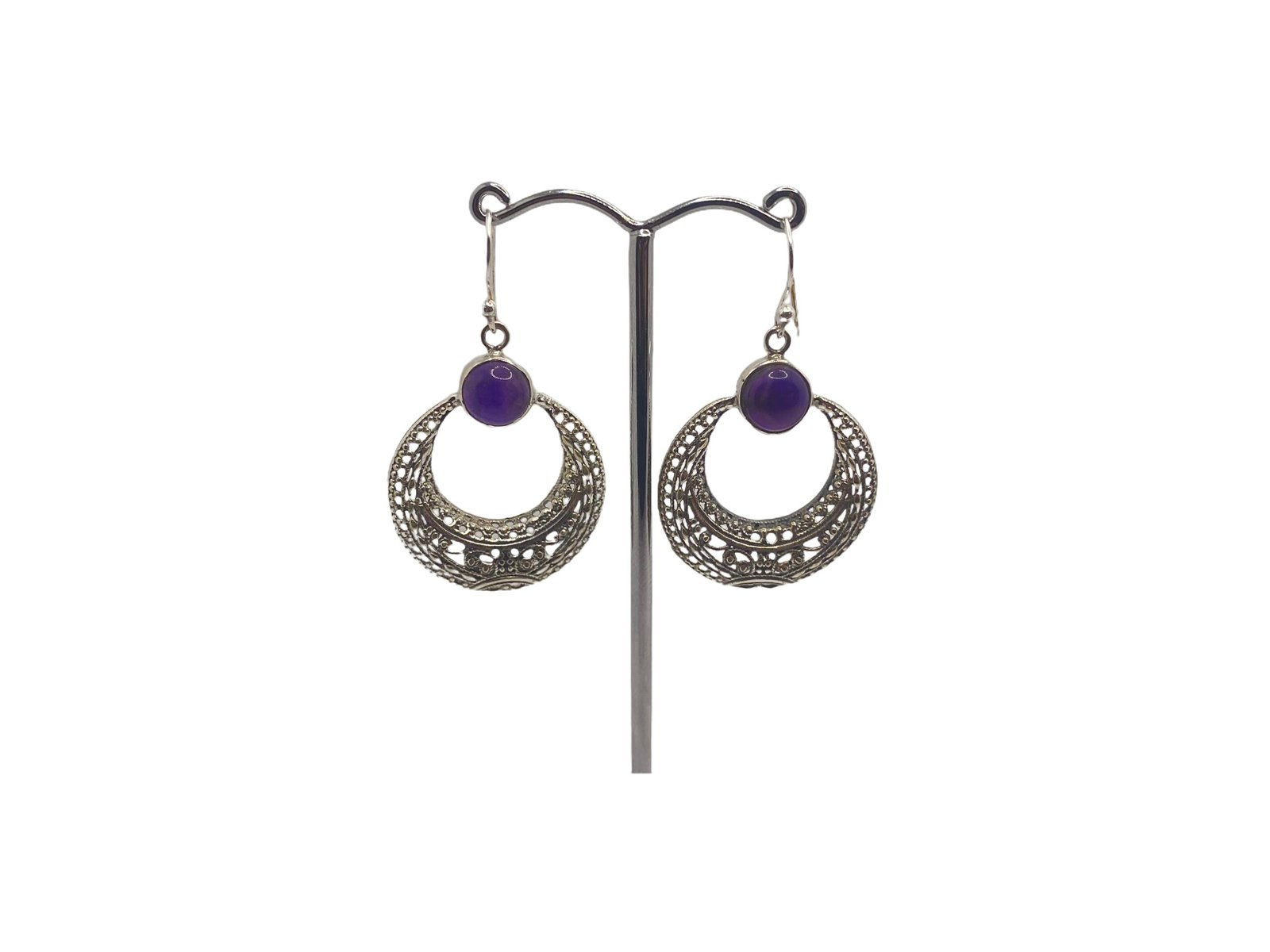 Estos pendientes de plata de ley 925 con amatista destacan por su diseño impactante y elegante. Con unas dimensiones de 3.9 x 4.2 cm, son una pieza llamativa que realza la belleza natural de la amatista y aporta un toque de distinción a cualquier atuendo.